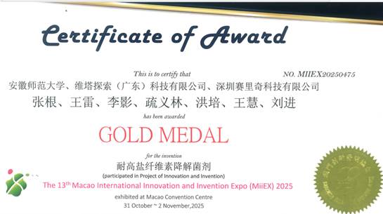 近日,澳门创新发明协会公布了2025年度“澳门国际创新发明展奖”名单,我校作为第一完成单位申报的“耐高盐纤维素降解菌剂”项目获金奖,是我校首次获得此类科技奖励。学院客座教授、外聘硕士研究生导师张根为第一完成人,李影、疏义林、洪培副教授为项目主要完成人。