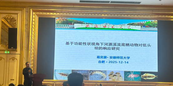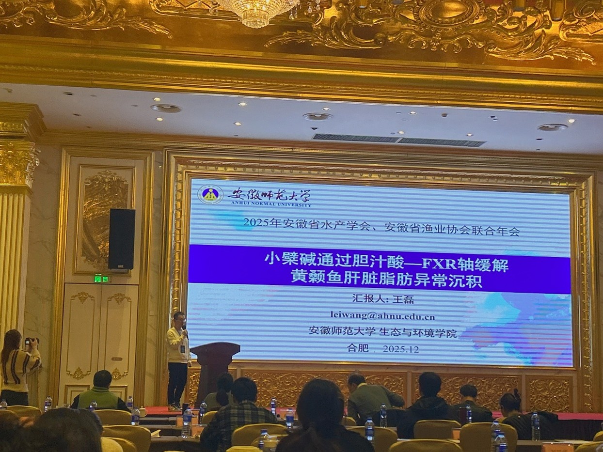 我院严云志教授、青年教师葛奕豪、王磊及研究生代表一行14人应邀参加了本次大会。会议期间,我院师生积极参与各项学术交流活动,充分展示了我院在水域生态与渔业领域的科研实力。在学术报告环节,我院青年教师葛奕豪和王磊分别作了题为《基于功能性状视角下河源溪流底栖动物对低头坝的响应研究》和《小檗碱通过胆汁酸—FXR轴缓解黄颡鱼肝脏脂肪异常沉积》的学术报告,分享了团队在水生生物多样性保护及鱼类生理生态响应机制方面的最新研究进展。在研究生论坛上,我院研究生汪恒作了题为《高脂饮食通过肠道微生物失调加重铜诱导的黄颡鱼肝肠毒性》报告,并获得研究生论坛优秀报告二等奖,展现了扎实的学术功底。